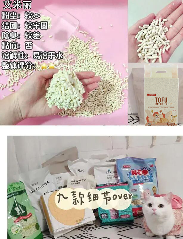 缺點一方面是各個牌子的含水量控制得有好有壞,囤積的時候偶爾有出現(xiàn)還未拆包就發(fā)霉的情況(畢竟還是有機物)。另一方面就是由于大顆粒又沒有粉塵,對便便的包裹性不是很好,自動貓廁所里完美適配豆腐砂的機型也比較少。此外價格也相對比較高。